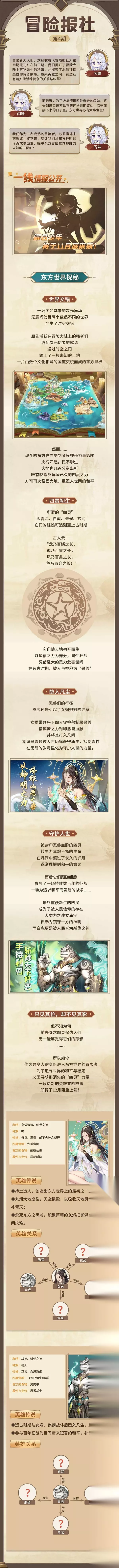◎Ta来自东方的某个神秘国度,能以凡人之躯,比肩太阳——神秘英雄,将于本月底上线! ◎突发次元异动,世界之间的隔阂意外打开!女娲、麒麟、四灵......东方神明们的传奇故事将逐一揭晓! 敬请收看闪妹倾力打造的《冒险报社》,带大家走进神秘的东方世界!