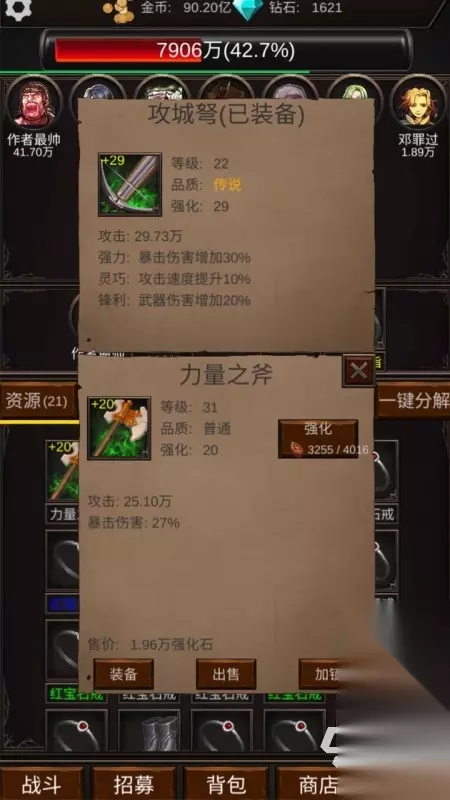 《组建军团打装备》游戏里设计了种种诡谲莫测的冒险洞窟,其中添加了多种能力令人炸舌的 Boss以及怪物,除此之外有着种种属性机制一枝独秀的高端武器等你获取,还加入了一些同样力量澎湃的战斗伙伴,来帮助你提升杀怪效率,在装备数值的设定上同样都是千差万别的,佣兵英雄在基础攻击力以及输出间隔上,都可通过武器的穿戴来提升数值。 高速下载 普通下载 5、《装备我只爆极品》
