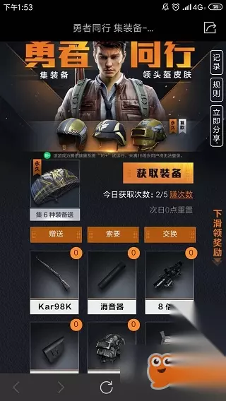 t15_2-t15_1:6.0 标签: 特殊使命 集装备领特殊使命头盔攻略 最新活动勇者同行,玩家需要收集装备可以领取头盔和降落伞,特殊使命的套装还有背包皮肤,游戏中的道具皮肤都可以获得。 进入方式:右边【活动】找到首款头盔皮肤,点击进去可以看到。 玩法介绍: 收集对应的装备,6个装备可以组合成一套,玩家直接用这个兑换对应的道具奖励,组成装备就是要通过自己去获取,或者是别人赠送,每天都是有5次的获取机会,还有别人的赠送机会,可以收集套装。 道具:98K、消音器、8倍镜、托腮板、三级头、三级甲。 赚取次数: 每天登陆游戏获得一次、赠送1个装备获得两次、索要成功1个装备获得1次、发出或者接受1次交换可以获得一次。