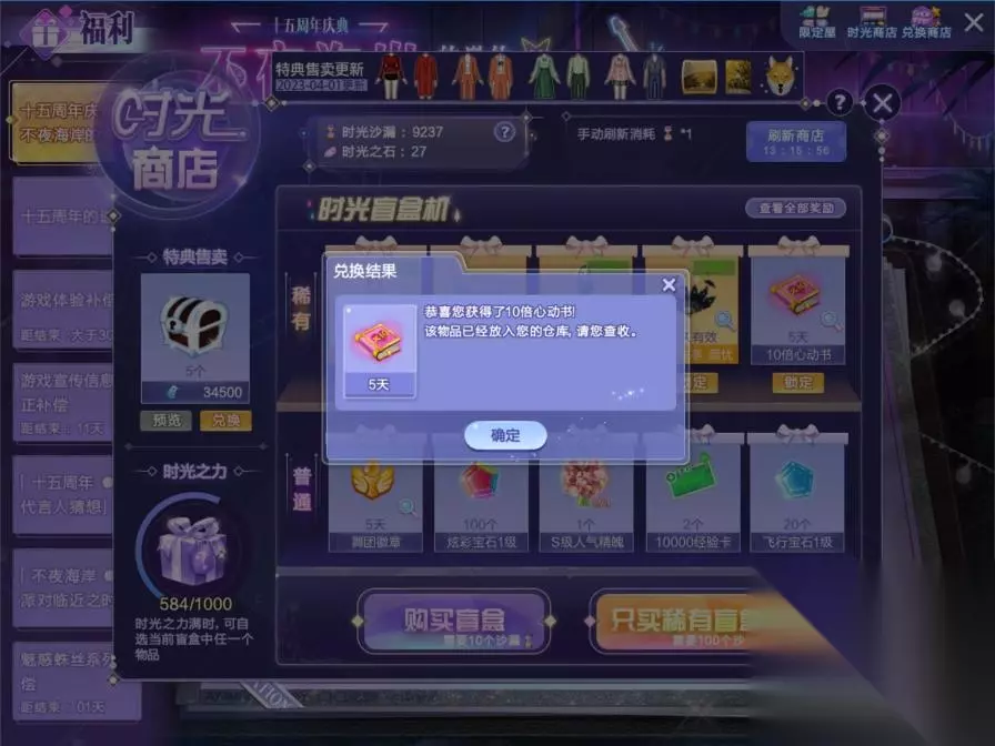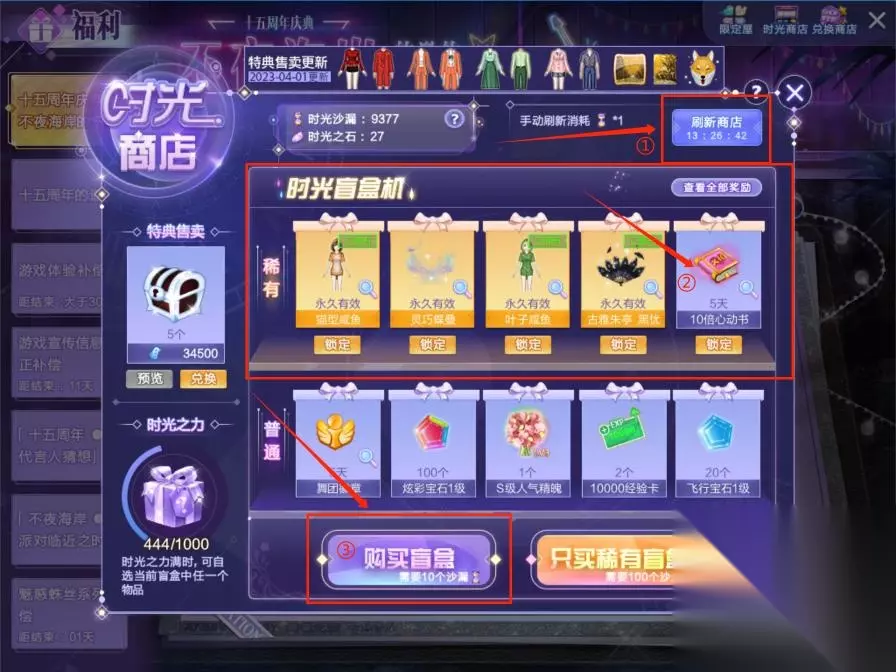 4、弹出时光商店后,玩家点击【刷新商店】,直到时光盲盒机的稀有格子中刷新出【10倍心动书】,玩家即可点击下方的购买盲盒。玩家需要注意,进入时光商店后稀有栏中已经出现【10倍心动书】就不需要刷新商店了。而且稀有格子中也会出现1天有效期的【10倍心动书】,玩家需要注意别看错,建议还是刷出5天有效期的最好。