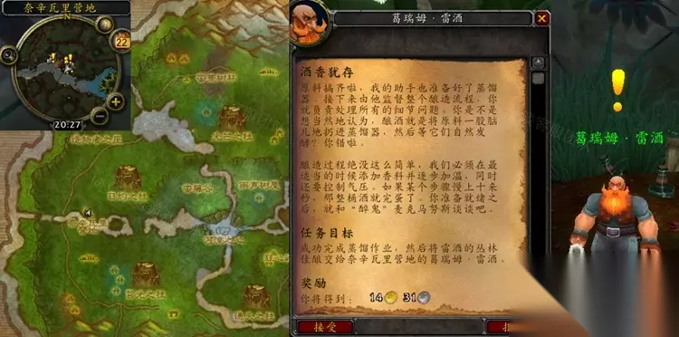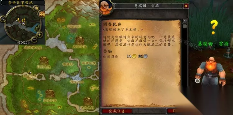 最近很多玩家都有求助《魔兽世界》怀旧服WLK酒香犹存任务怎么做的攻略,下面233乐园小编就来详细的为大家讲解一下,一起来看看吧。这款游戏中,新活动新内容层出不穷,这样能给玩家持久新鲜的游戏体验,同时玩家也会遇到一些不会做的任务,不了解的游戏玩法,不要担心,本站为大家带来这款游戏最全的攻略教程,快来了解一下吧。 怀旧服WLK酒香犹存任务怎么做 接取等级:76 接取NPC:葛瑞姆·雷酒(索拉查盆地,奈辛瓦里营地) 完成NPC:葛瑞姆·雷酒(索拉查盆地,奈辛瓦里营地) 奖励声望:无 任务开始: