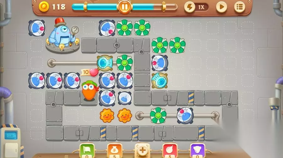 开局在上方两个滑道上建造一个风扇,一个雪球,这样可以保证前期怪物不会到达萝卜那边。