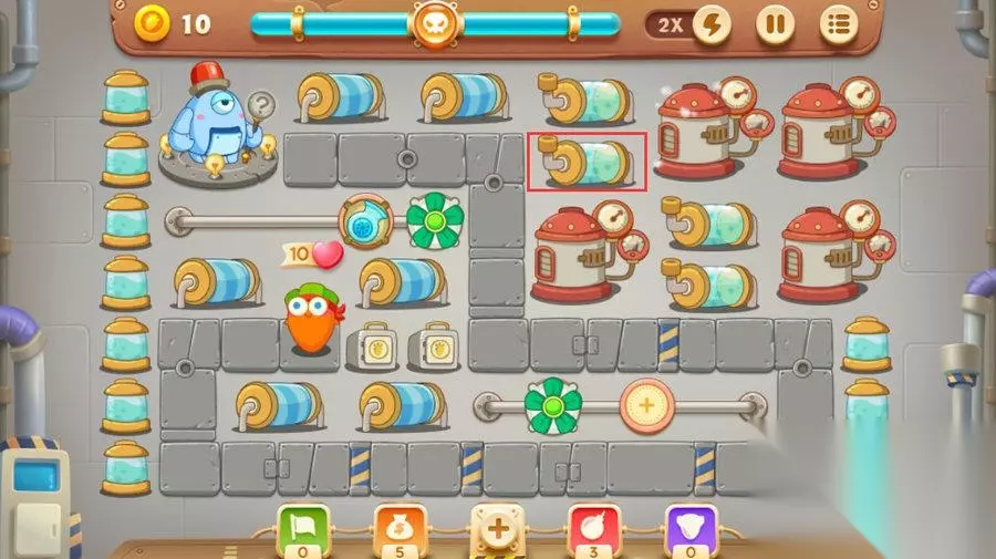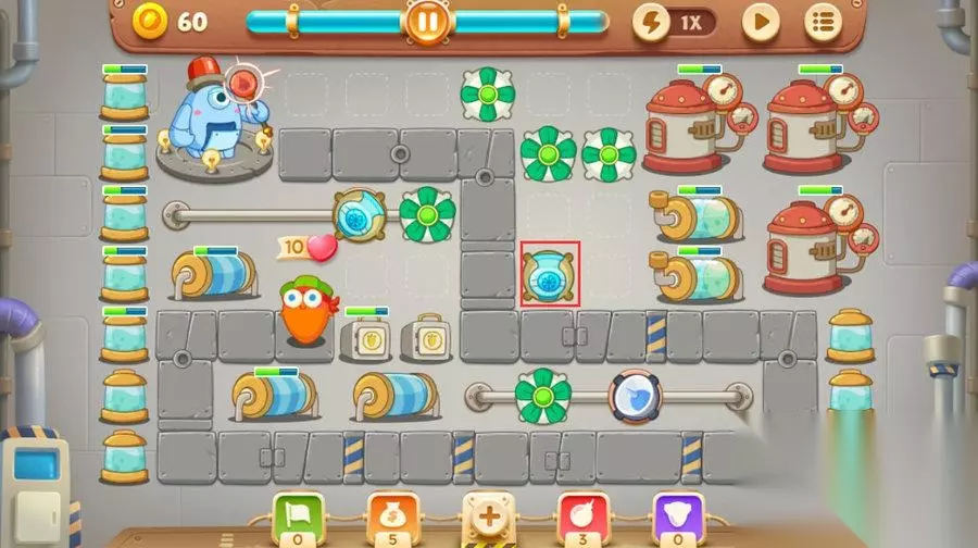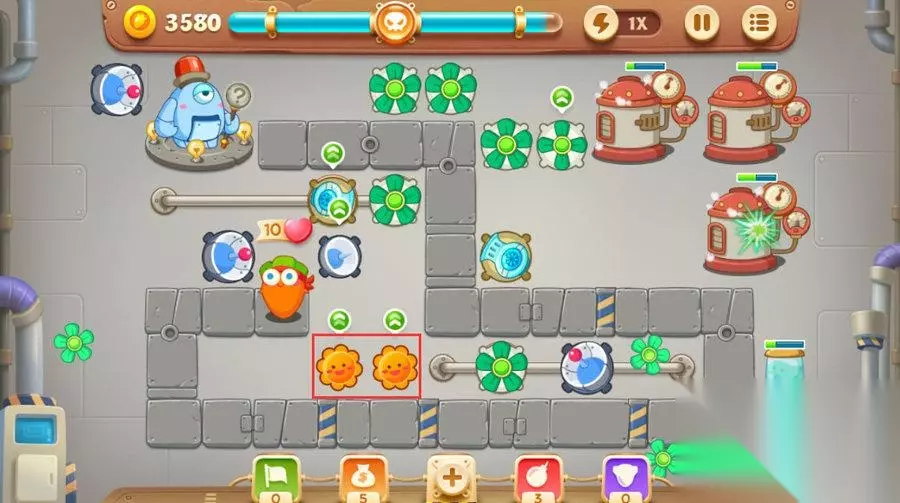 接下来我们要迅速的在下方滑道建造一个风扇不然很可能就有怪物漏掉。 图上红色标注的地方有两个隐藏的风扇。所以前期优先把这个地方的障碍消除,这样可以很好的保障萝卜的安全。