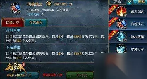 风卷残云:群攻技能,对目标四周单位造成减速效果,持续4秒,造成一定的法术攻击,额外附带一定的法术伤害。我们可以看到,此技能属于限制技能,除了法术攻击以外还会有减速效果,所以在打怪的时候可以选择瞭若观火,可以打出更多的法术伤害,而在玩家对战中可以选择风卷残云,对敌方玩家造成减速效果,但是此技能的冷却时间也相对长一些有12秒。