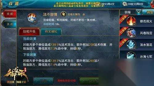 水淹七军:冷却时间15秒,对周围持续造成一定法术攻击,额外获得一定法术伤害,每次都有10%几率使敌方冰冻1秒。此技能为持续输出且有几率打出限制定身技能的效果,那么相比流水落花更适合玩家对战中的选择。