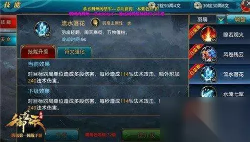 落水流花:此技能冷却时间9秒,技能效果会对目标四周单位造成多段伤害,每秒造成一定的法术攻击额外附带一定的法术伤害。
