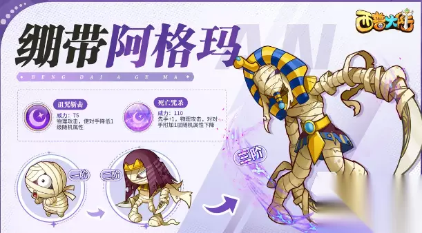 8、月光神水号 月光神水号是水系,它是一辆诞生在海底的赛车型精灵,喜欢自由自在的漂浮在海面,它的技能会使用自身魔力形成水柱,想敌人射出造成伤害,自身每存在一级属性强化,该技能威力就增加20%,最多威力能增加到100%,它的绝招可以对敌人造成伤害并随机获得两层的属性强化。 9、绷带阿格玛 绷带阿格玛是暗属性的,它身上缠绕的绷带就像诅咒一样,会不受控制不断的生长,这份诅咒之力赋予了他非常强的攻击力,让很多猎物遭遇不幸,成为了受害者,它的技能诅咒斩击是物理攻击,会让对手随机下降一级的随机属性,它的绝招能给对手附加一层的随机属性下降。