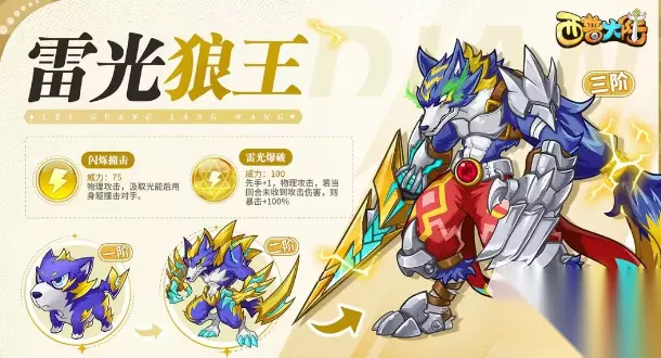 1、雷光狼王 雷光狼王是雷系,由雷小狼进化而来的,原来是个体型非常小的狼,奔跑起来很快,在电系精灵中是非常强大的存在,它的第一个技能可以用高电量的电刃攻击对手,如果自身存在聚气的话,攻击时能加100%暴击率,它的二技能会斩击对手并且吸取它的能量,使用后能获得一层聚气效果,它的绝招可以让自己先手对敌方攻击,如果这个回合没有受到任何攻击伤害,就能加100%暴击率。