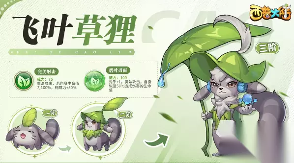 4、圣印飞龙 这只也是钢系,它出手狠厉果决,极具野心,飞龙的一技能会使身体旋转撞击对手,如果对手已经行动的话,这个招式的威力会增加50%,它的绝招是物理攻击,还能提升自身一级的物攻和物防。 5、飞叶草狸 飞叶草狸是草系,这是一只非常喜欢晒太阳的小狸猫,它有一片大叶子,不管走到哪都会携带,传闻中这是片神通广大的叶子,能让飞叶草狸变身成任何物品,它的技能完美射击时魔法攻击,如果使用的时候自身生命值是100%的话,威力还能提升50%,它的绝招也是魔法攻击,能恢复自身50%造成伤害的生命值。