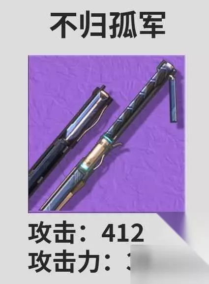 1、满级飞景能够为散华提供36.4%的攻击力加成,这把武器的攻击力白值也比较高。 2、作为一把月卡四星武器,飞景的获取难度和精炼难度都比较低。 三、备选武器 不归孤军 攻击:412 攻击力:30.3%