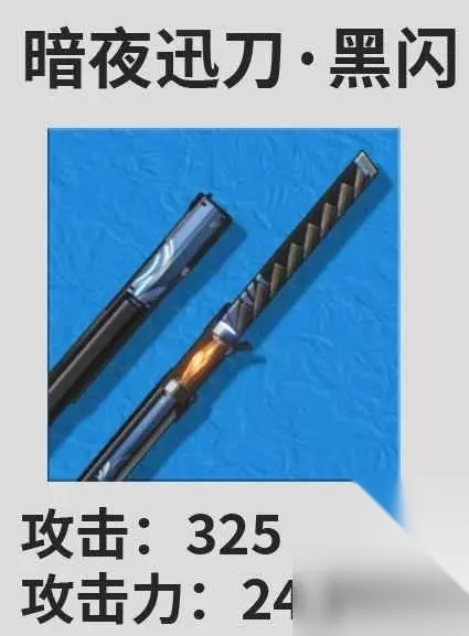 这两个武器属性上也可以带来一定提升,优点是获取提升容易,比较好满精。但整体的加成不如以上两个武器。 四、过渡武器 暗夜迅刀·黑闪 攻击:325 攻击力:24.3%