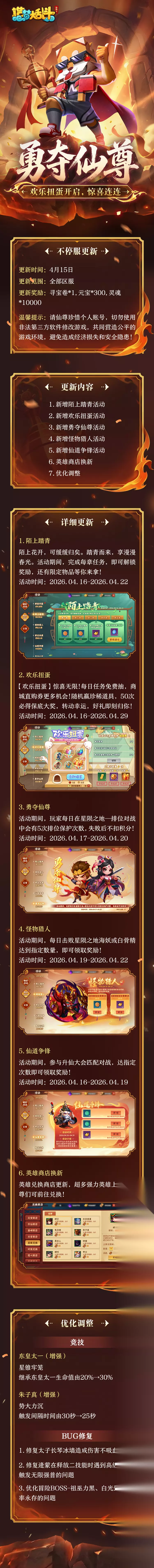 为了给仙尊提供更良好的游戏体验,《造梦大乱斗》于2026年4月15日17:00-17:30进行不停服更新,由此造成的不便,敬请各位仙尊谅解! (开发中素材仅供参考,各活动的奖励配置以实际游戏为主)