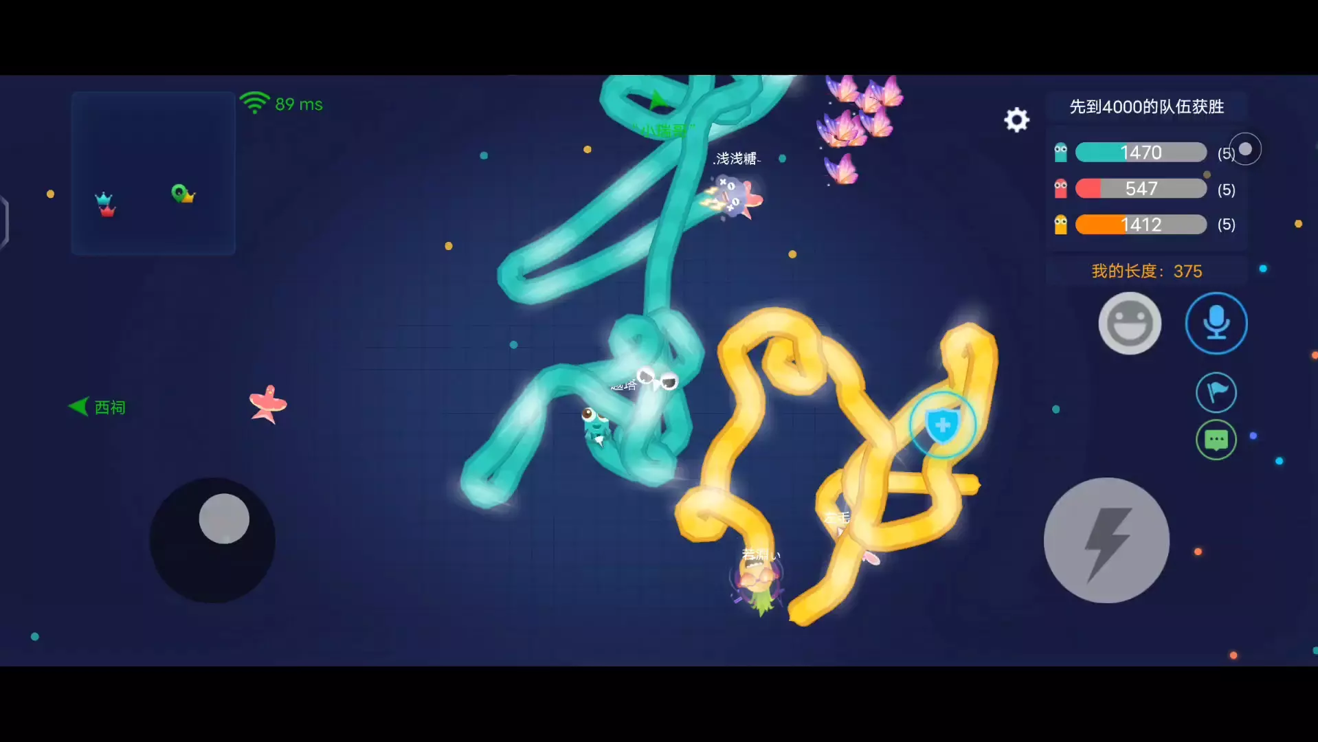这是《贪吃蛇大作战》团战模式的游戏内容,玩家使用和尚皮肤进行游戏,该皮肤表现强势,蜜蜂皮肤在对战中处于弱势,玩家在游戏里努力提升贪吃蛇长度,朝着先到4000的获胜目标推进。
