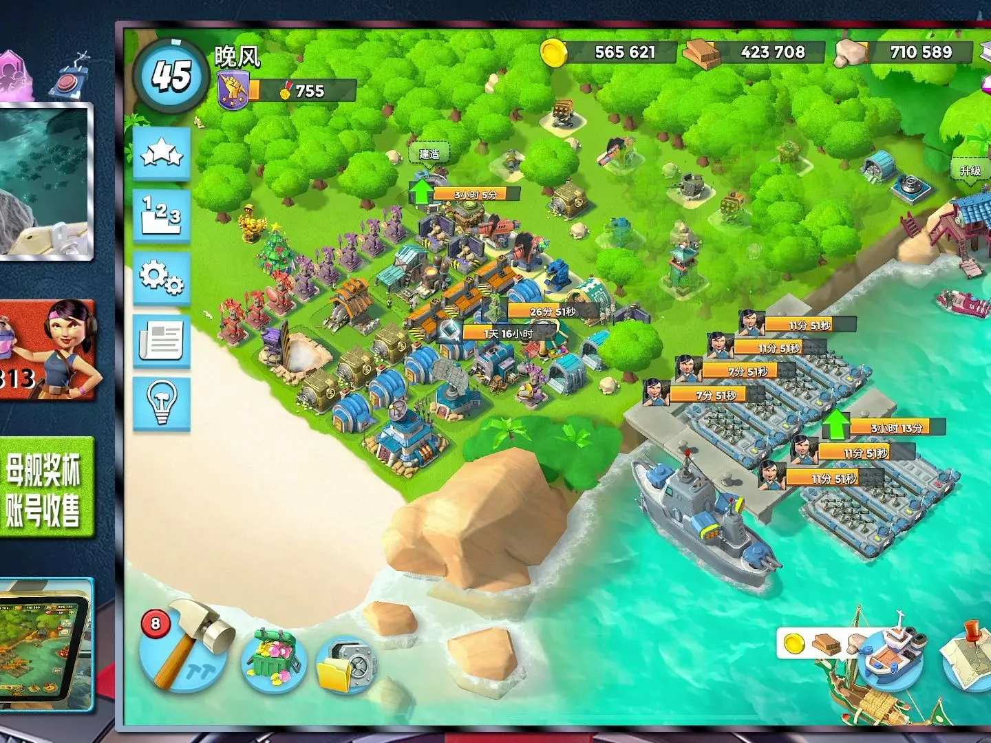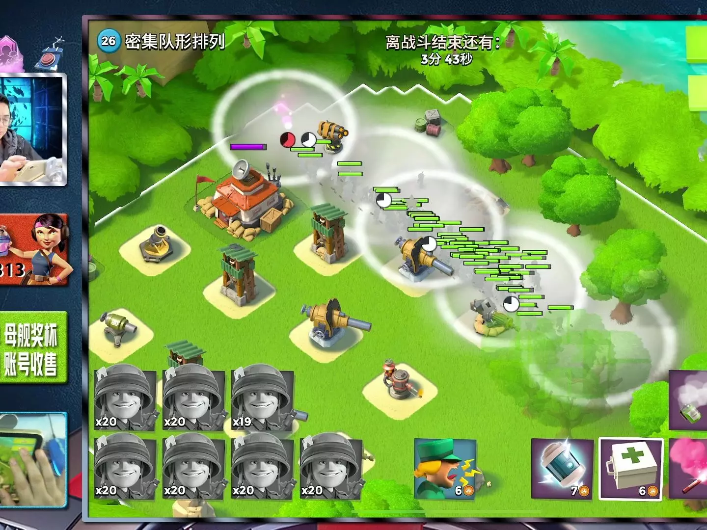 这是《海岛奇兵》的新手教学内容,针对16本500杯+的玩家,展示了基地布局、等级信息、医药包道具,还有兵种与建筑升级界面,主播还提供代练相关服务。