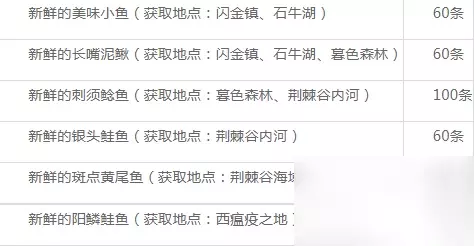 150级到300级升级: 150-175点继续制作刺须鲶鱼,约需要40条新鲜的刺须鲶鱼。 175-225点制作银头鲑鱼,约需要60条新鲜的银头鲑鱼。 食谱获取途径:可以前往荆棘谷,找凯尔希·杨斯购买。 学习大师级烹饪,需要完成加基森任务:蚌肉大餐。 225-265点制作斑点黄尾鱼,约需要40条新鲜的斑点黄尾鱼。 265-300点制作水煮阳鳞鲑鱼,约需要40条新鲜的阳鳞鲑鱼。 食谱获取途径:可以前往塔纳利斯,找吉科希斯购买。 由于部分制作为绿色熟练度,因此所需鱼类可能出现略有缺少或多余: