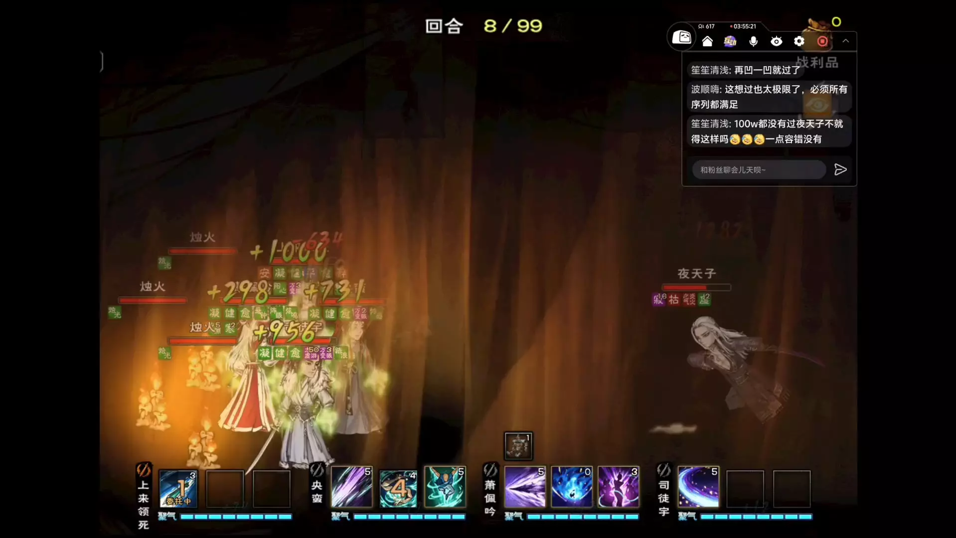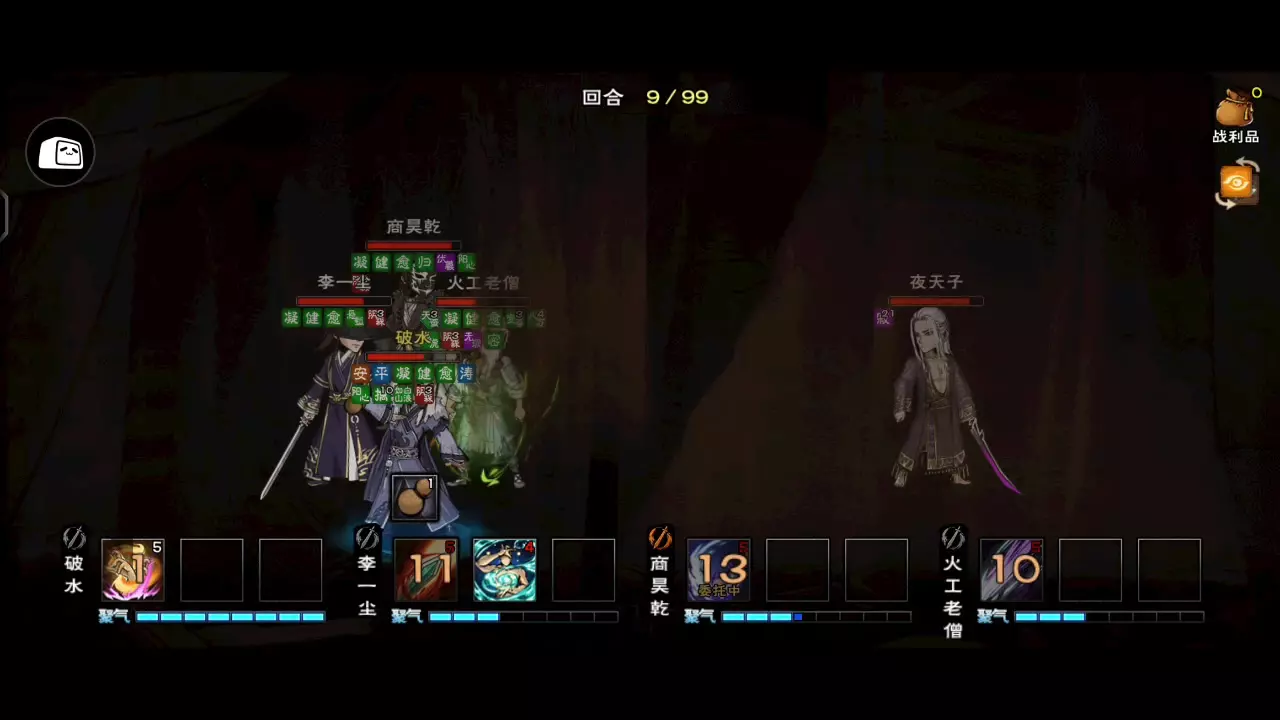 这是游戏《烟雨江湖》的主线内容分享,玩家在充分准备后,开启主线夜天子关卡,展示了与夜天子战斗的多回合对战画面,包含角色技能释放、血量变化等战斗细节。