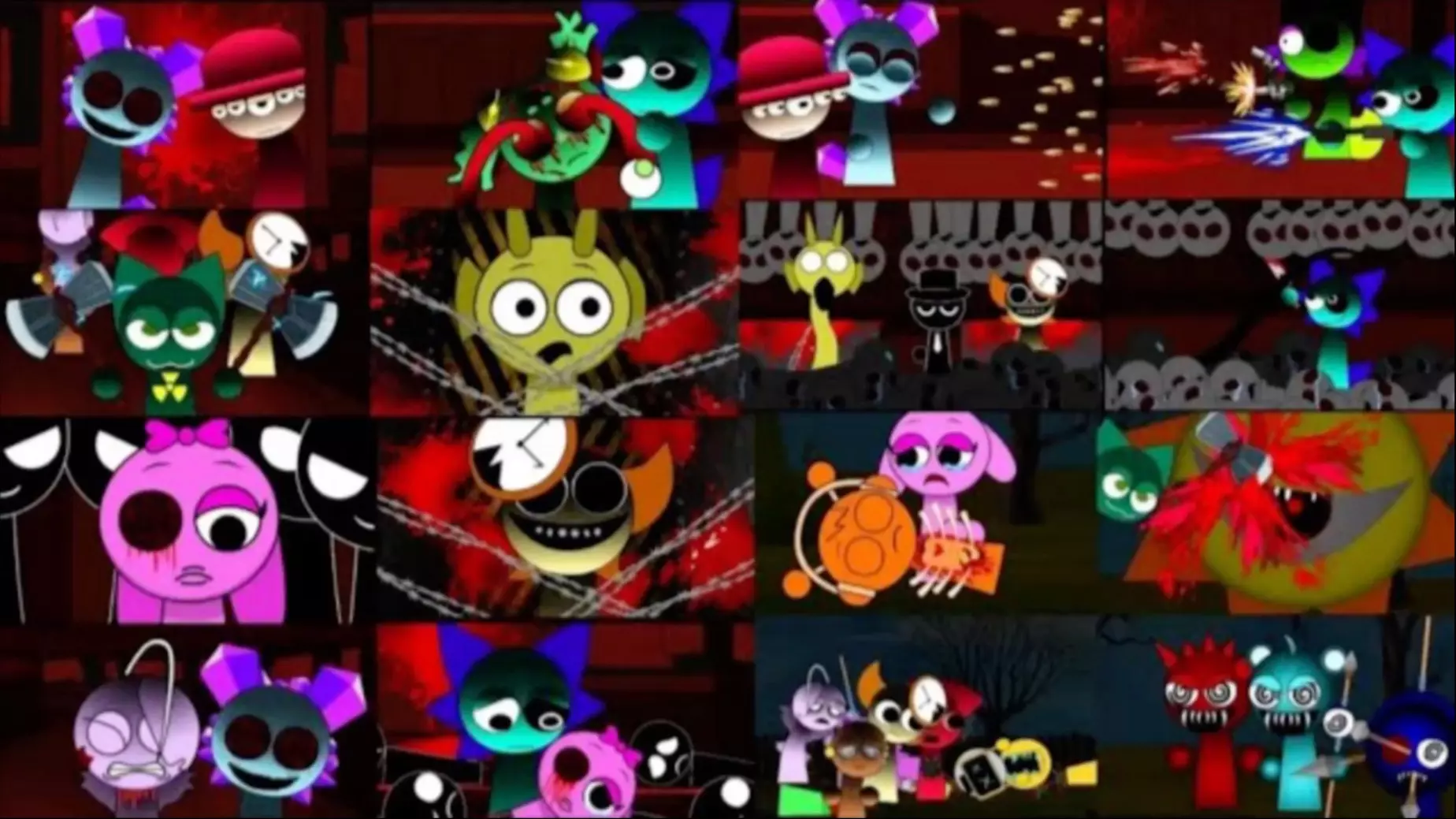 这是音乐游戏sprunki的衍生创作内容,展示了游戏角色陷入“疯狂”状态的另类形象,角色们神态诡异,部分带有血迹元素,呈现出和原版风格截然不同的暗黑氛围。