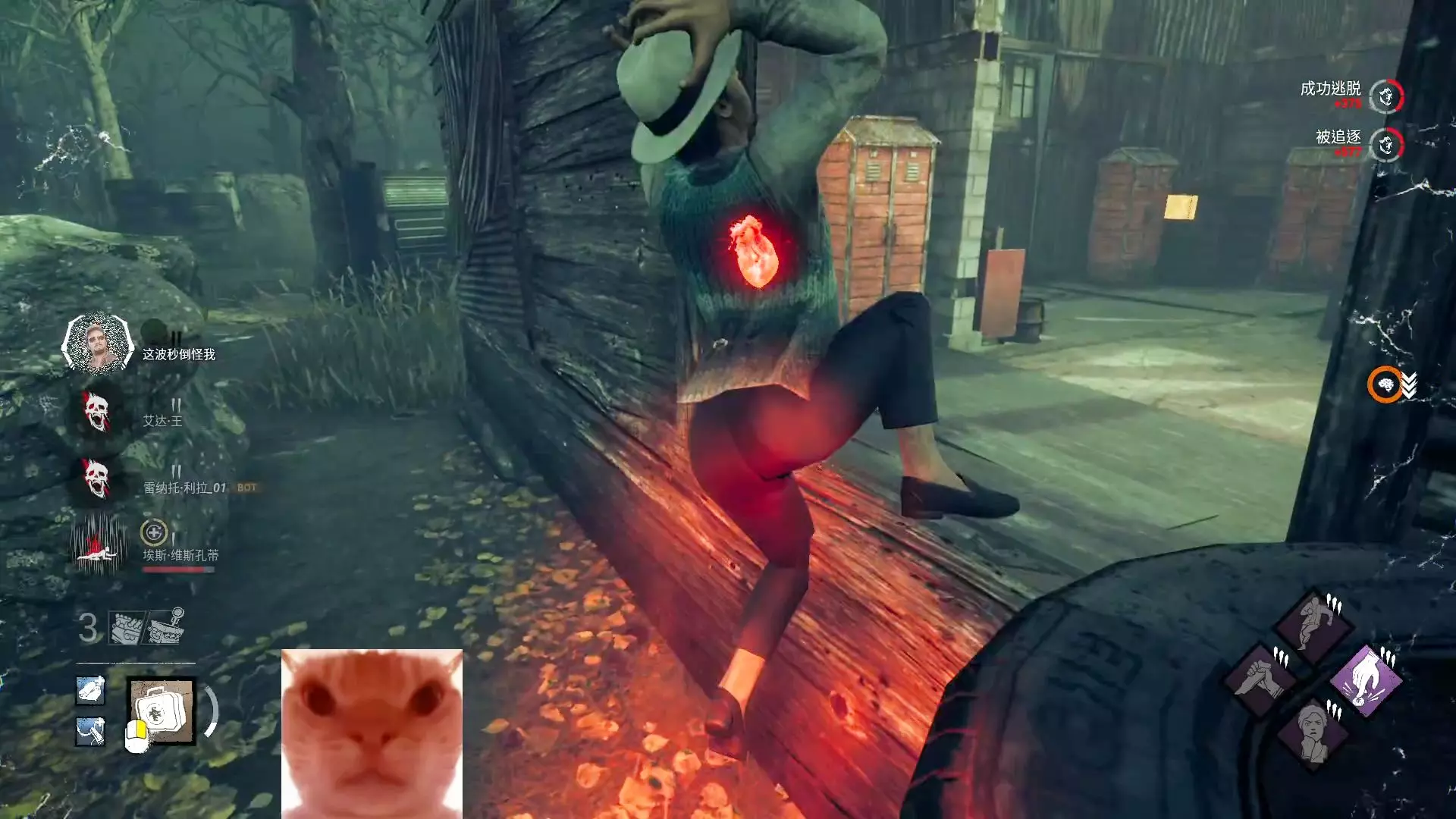 这是《黎明杀机》的速通局游戏内容,展示了玩家以屠夫视角进行游戏的过程,画面中呈现了游戏场景、屠夫技能使用,还有观众弹幕互动讨论游戏技能、画质等内容,玩家目标快速结束本局开启下一盘。