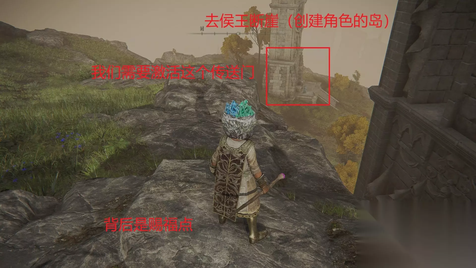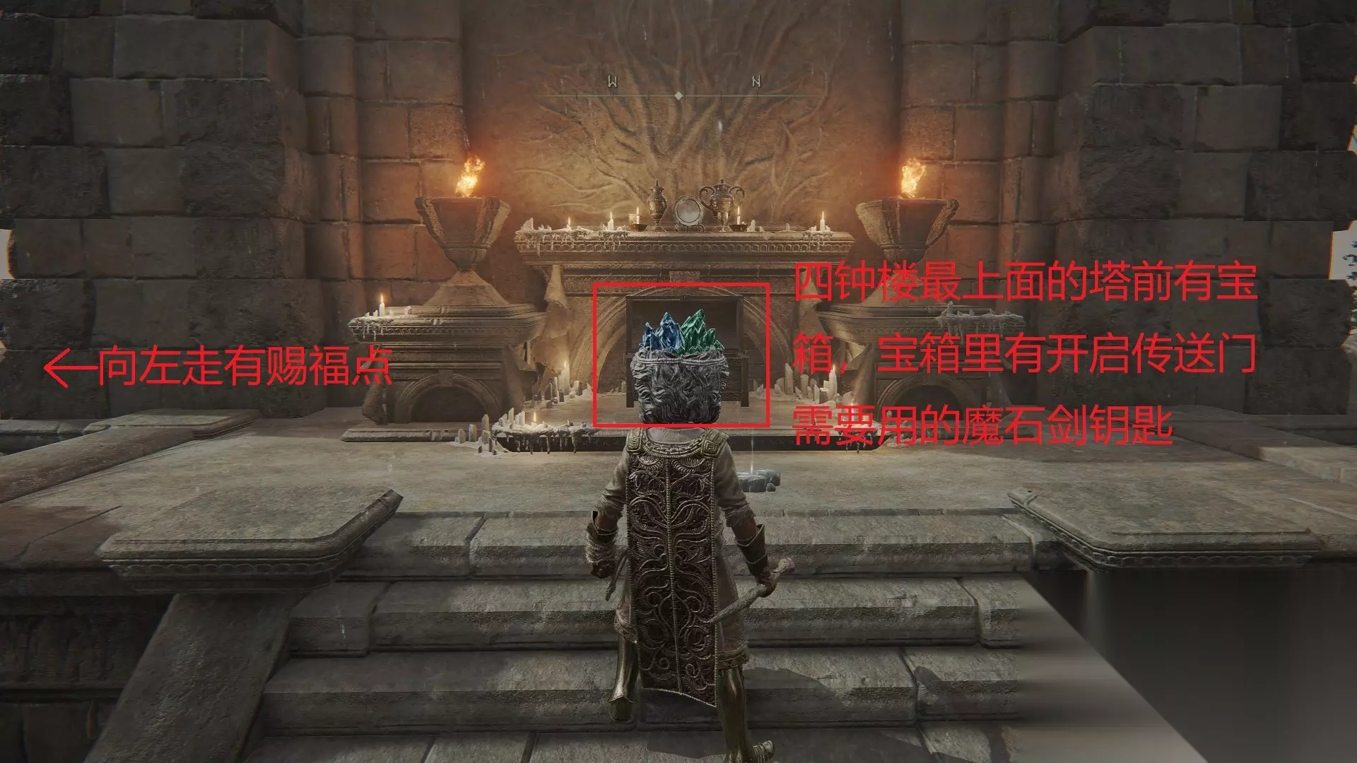 (2)四钟楼最上面这个塔前有个宝箱,宝箱里面有魔石剑钥匙;并且塔旁边就是赐福点