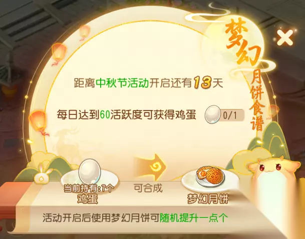3. 制作月饼·团圆盛宴 又到了一年一度的中秋节,在中秋前夕阶段,每日完成日常活动、达到60活跃度即可获得制作梦幻月饼的材料;在团圆盛宴阶段,可以使用材料制作梦幻月饼,提升属性。