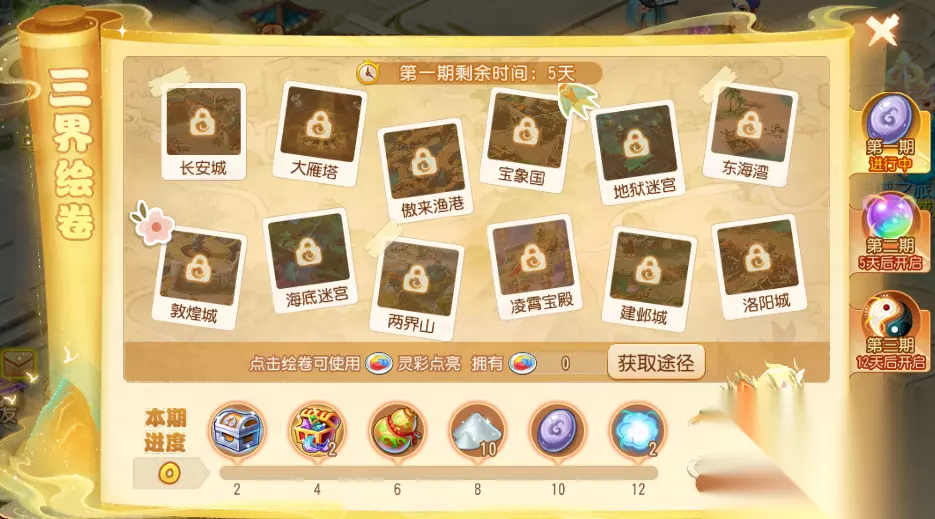 2. 福利活动·三界绘卷 完成每日活跃和挑战任务,即可使用灵彩点亮三界绘卷,获得玉霄马坐骑、未鉴定的纹饰、七彩幻色丹、法宝精华礼包等丰富奖励。