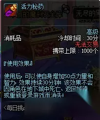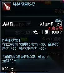 这个药剂可以直接在商城进行购买,效果非常恐怖,直接减少所有技能冷却时间30%,某主播就利用这个药水和特殊的装备搭配,达成了无限大拔刀的效果。但是它的缺点也非常明显,只有15秒的时间,而且冷却时间10分钟,这意味着刷一次图基本只能用1个。也因为这个原因,它也被称为“15秒真男人”。 八、强韧能量秘药