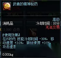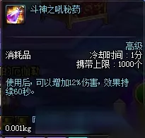 这类药剂的效果非常显著,直接减少所有技能的冷却时间,根据药水不同,减少的时间也有所不同。其中较好的便是精神刺激药水,可以减少20%的冷却时间,但是价格比较贵,大概在2.5W左右1个。同时它的好处也比较明显,就是持续时间足足有10分钟。另外一种是净化的冰石碎片,直接减少13%的技能CD,它的优点就是价格便宜,冰石碎片才4000金币左右1个,但相应的它的效果和持续时间都稍微弱一些。 四、斗神之吼秘药
