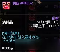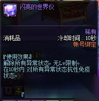 这可是非常好的药剂,直接解除所有异常状态,没有等级限制,而且会在接下来的10秒钟内所有异常状态免疫,在刷图过程中难免会遇到混乱、眩晕等异常状态,这个药水能很好地解决这些问题。与它相同的有雷米的援助等,但是没有10秒内免疫异常状态的效果。世界仪可以在商城直接购买,也可以从盒子里面开出来,一般都是账号绑定的,所以可以分配给各个角色。 六、霸体护甲药水