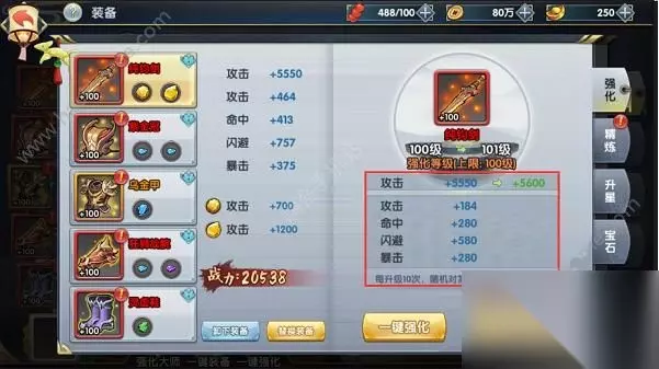 抓到心仪的宠物,可以点开宠物界面进行培养,可以选择宠物经验丹或者其他白色、绿色弃置的宠物当做宠粮,提升宠物等级,可以明显感觉到增加属性和战斗力。更有趣的是宠物合成系统,可以打开宠物界面的炼妖炉,将属性不满意、类型相同的宠物二合一,产出全新属性的宠物。【装备系统】当少侠开启穿戴装备功能,装备可以随着角色等级的提升,进行相应的强化,获得装备属性的提升,后续章节会陆续开放装备精炼、镶嵌宝石等功能,大幅度提高装备属性。每个角色可以佩戴5件装备,每件装备都对应着5个基础属性。武器(攻击),帽子(法防),衣服(物防),手套(生命),鞋子(速度)。每件极品装备都会有4个附带属性,而且可以出高级属性,命中、暴击、抗暴、闪避。小主可以根据角色需求不同,选择不同的装备佩戴,前期可以优先把高攻击、暴击、命中的装备优先给输出角色,闪避抗暴生命高的优先给前排穿戴,可以最大化提升战斗力!