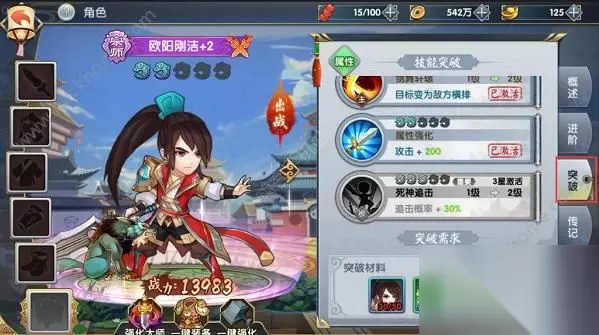 【人物突破】每次达到一定的等级。人物就可以进行一次突破,突破会大幅增加属性,甚至改变技能形态,例如主角开场技能是单体攻击,突破一次,就可以变成强有力的群攻。主角碎片是主线任务一直送的,非常贴心。
