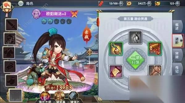 前期属性养成,主要是靠进阶和突破,主角突破所需要的人物碎片会跟随主线任务的完成一直赠送;进阶材料,在闯关的时候就会掉落,还有非常方便的一键扫荡功能帮玩家快速完成。