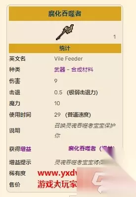 泰拉瑞亚灾厄是一个泰拉瑞亚知名度非常高的大型mod,在里面有大量的新武器,腐化吞噬者就是其中之一,也是制作永夜之眼武器所需要的材料之一,很多的玩家不知道要怎么制作这个武器,小编也给大家带来了相关的武器合成表介绍,让大家知道要怎么合成这个武器,具体如下: 泰拉瑞亚灾厄腐化吞噬者召唤杖怎么合成?灾厄腐化吞噬者武器合成表 腐化吞噬者是一种在困难模式之前可以制造的召唤武器。它会召唤一个灵魂吞噬者的婴儿仆从。 在玩家周围飞行,飞向附近的敌怪并附着在敌怪身上,在定期造成接触伤害的同时。 合成配方是5个魔矿锭,9个暗影鳞片,20个乌木,在铁砧上合成 可以通过打败世界吞噬怪获得材料 还会召唤一些跟踪的小吞噬者弹幕(就像腐败者的戟一样)。它是疤痕撕裂者腐败地图的相应版本。
