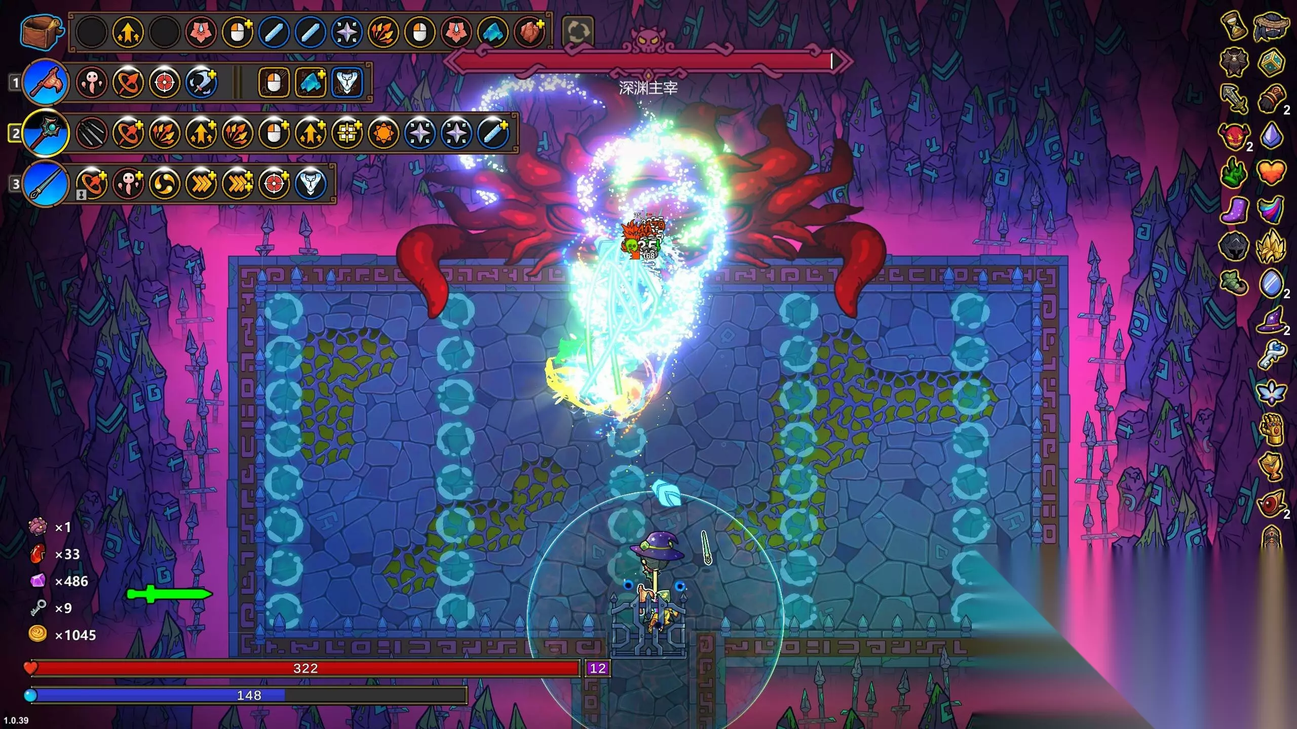 打出的效果大概如图,借助法术的奥数新星的复制特性,将伤害法术迭代的释放出去,配合寻路法术的集火功能迅速打出一个让人看不懂的伤害。考虑到奥术新星过高的稀有度,这个 组合可以下位的使用分裂+导线+伤害法术进行增殖。 需要注意的是,由于复制不读取迭代的特性,分裂的奥术新星只会释放一个不具有任何额外释放能力的飞弹效果,因此这种迭代实际上不能通过分裂进行进一步放缩。不过,考虑到5倍的蓝耗增值,大部分法杖都不能支撑这种迭代的复数上升,不过,笔者也在训练中进行了一个模拟: