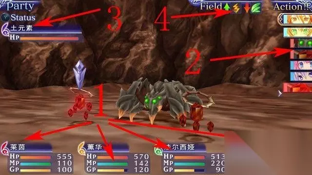 界面 这是战斗界面,如下图箭头1所示,这四个箭头分别指向四位主角的头像, 这里是四位主角的信息,如果四位主角全部被杀,游戏就会结束,从上次保存的位置重新开始。 如下图箭头2所示,这里是人物列表,从上到下是人物的攻击顺序。 如下图箭头3所示,如果选择了敌人,这里就会显示该敌人的生命值。 如下图箭头4所示,这里是战场的属性,需要根据这里的信息合理搭配内衣。