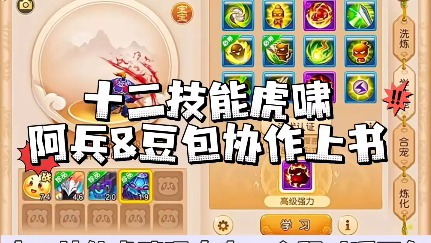 《梦幻西游手游》中,旭旭宝宝帮思念哥给12技能力劈宝宝上书,过程中选择高级必杀、高级突进等兽诀进行打书操作,展示了宝宝打书的全过程。