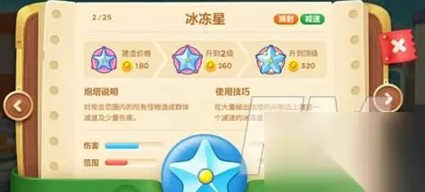 2、群体减速 在糖果赛中,小怪会逐渐变得很强大。如果没有有力的减速炮塔,糖果可以会被追上去吃的,分数自然就上不去了。而论减速,冰冻星毋庸置疑的是NO.1的选择。如果实在没有冰冻星,雪球也是可以接受的。