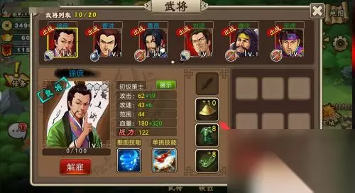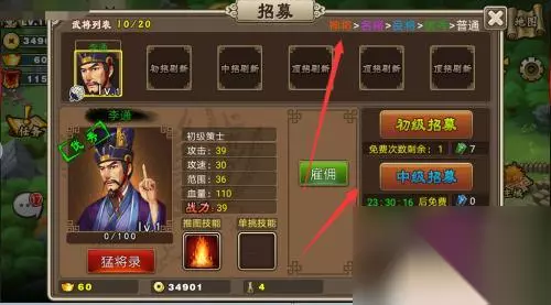 2.按照界面提示,招募武将,武将品质越高属性越好。