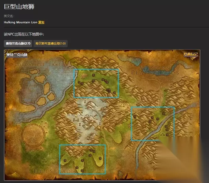 温馨提示 山地狮强度不高,玩家完全可以一个人完成这个任务。 山地狮分布非常,密集,而巨型山地狮则需要玩家分散寻找。 Tags:魔兽世界怀旧服攻略大全
