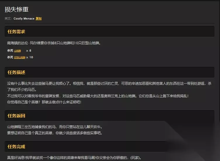 魔兽世界怀旧服南海镇损失惨重任务怎么做?WOW希尔斯布莱德丘陵巨型山地狮在哪儿?玩家在南海镇做任务的时候会接到损失惨重任务,要求玩家猎杀巨型山地狮,可是有很多玩家不知道它们在哪儿,今天86来告诉大家巨型山地狮在哪儿打,具体操作如下: 损失惨重任务怎么做? 玩家可以在南海镇的马厩里接取到损失惨重任务,具体坐标如下: