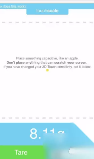 touchscale屏幕电子秤 网站地址:点击进入 介绍:是一款最近非常流行的手机称重工具,用户可以将水果放在屏幕上,然后就会显示出该水果的重量,精准度还是很高的,这款软件使用起来非常的方便;