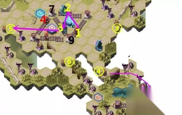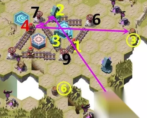 到1号路线那里把黄色操纵器操纵下,把月亮的平台降下去。 把13号炮台移到最右边,操作5号炮台通过11、12可以点燃13号炮台。 13号炮台移到中间,就可以打掉⑥号木桶。 二、boss打法 ④⑥号路线最后的boss难度较大,尤其是⑥号路线最后的boss,有3个是直接切后排的怪。最常见的打法就是攒满能量,进去主力输出2波大招就结束了。 这个时间拖的越久,对自己越不利。 三、一图流