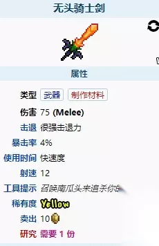 标签: 无头骑士 、 南瓜 泰拉瑞亚无头骑士剑怎么样?无头骑士剑作为游戏内的一把强力武器,想必还有很多玩家们不是很了解,那么接下来就带给各位玩家们泰拉瑞亚原版永夜刃武器图鉴,不要错过。