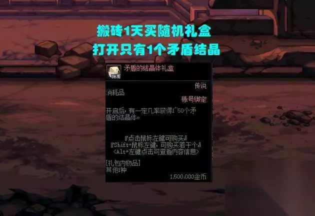 如果你觉得单个矛盾结晶体收益太低,那么还可以考虑买“矛盾结晶体礼盒”,可以从1-50个矛盾结晶体中随机获得,加百利售价150万! 兄弟们懂我什么意思呢?新副本搬砖一整天(188pl)收益也就在150-200万左右,而一个随机礼盒恰好就是150万,这就相当于,你辛辛苦苦搬砖一天,然后买了个矛盾随机礼盒,打开发现只有1个矛盾结晶,离谱! 按照8万单价为例,最起码要开出19个矛盾结晶体才勉强够本,但国服概率大家都懂,估计只有22%成功率!