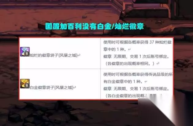 当然了,此改动韩服也有修改,咱们姑且可接受,而真正觉得不开心的是:“绿色宠物装备”的自动拾取功能,也被国服特色移除了! “自动拾取”根本不影响伤害提升,本来就是为搬砖玩家量身定做的,结果你还移除了,这不是故意为难玩家吗? 【2、白金、灿烂徽章移除!】 在韩服的风暴幽城副本中,有概率产出白金徽章、灿烂徽章袋子的,而且还可以交易。