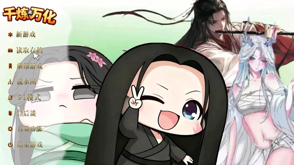 这是改编自《蛊真人》的galgame《千炼万化》,展示了游戏内的战斗剧情画面,出现白凝冰、古月方源、古月一代等角色,呈现了角色对战、剧情台词等内容,还有游戏主界面的相关选项。