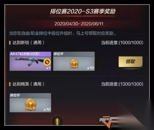 11. 活动名:排位赛2020-S3赛季奖励 福利指数:★★★★ 参与难度:★★★★★ 活动时间:4.30-6.11 活动奖励:排位武器、排位币、排位边框等 参与方法:游戏内