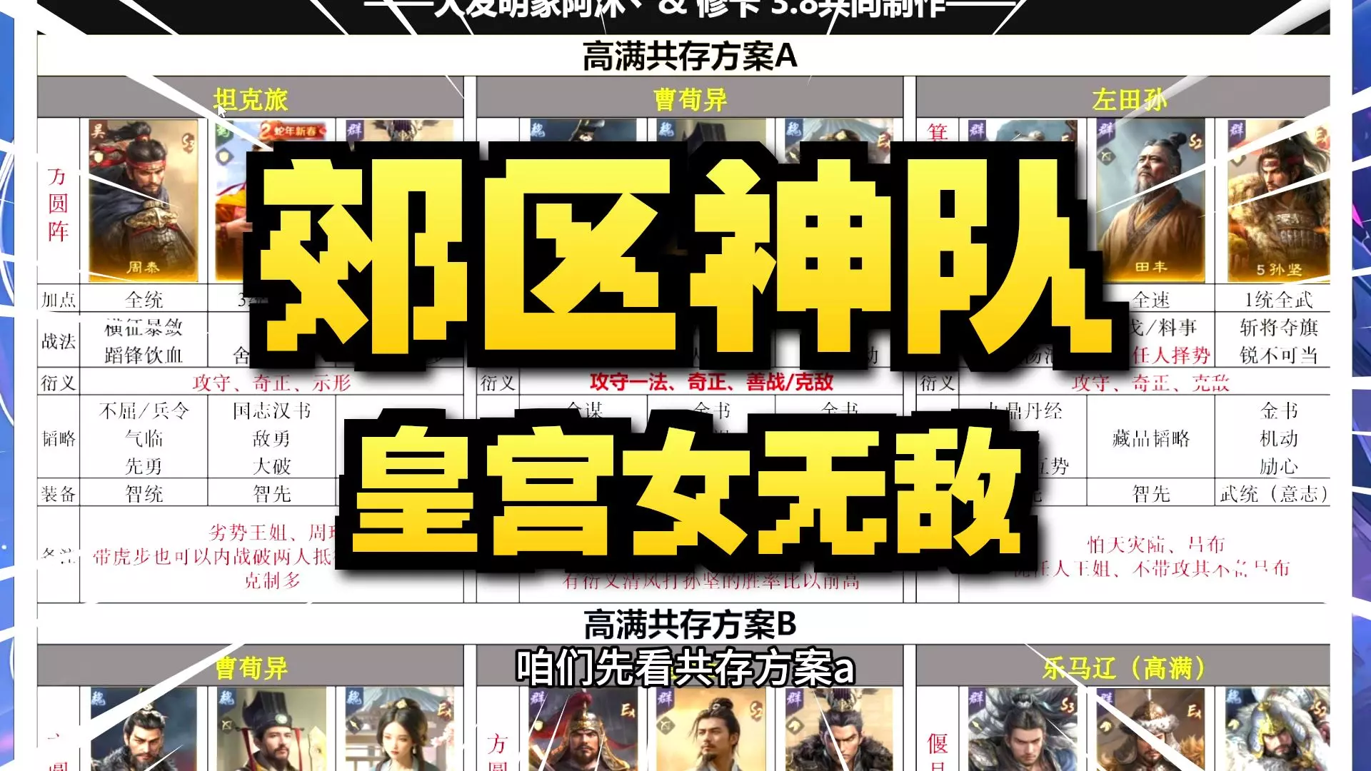 这篇帖子分享了《三谋》S1赛季的五队共存方案,包含A、B两个版本,涵盖大黄诸、皇龙骑等多支队伍的阵容、站位、加点、战法、韬略及装备搭配,平民玩家也能借此获取百万武勋。