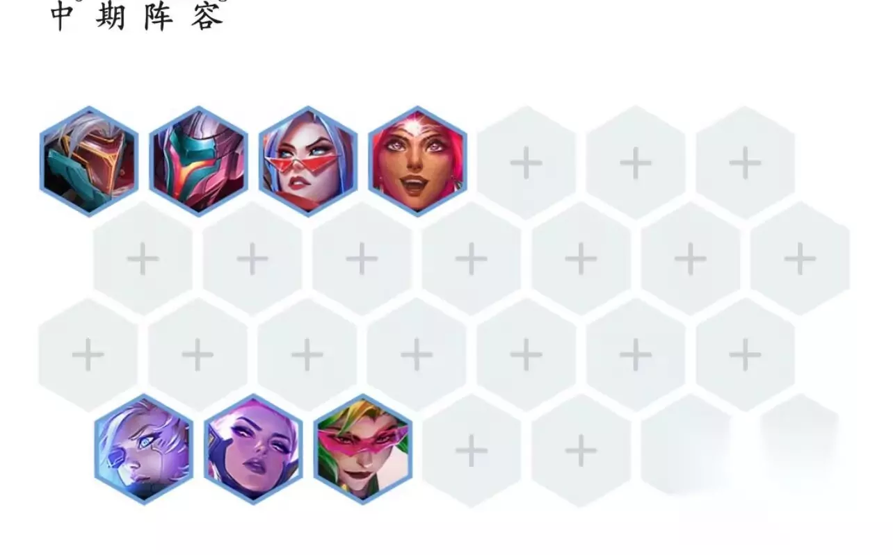 7、中期阵容:劫、亚索、菲奥娜、尼菈在第一排抗伤,寒冰、天使、薇恩在最后一排输出,如下图所示。