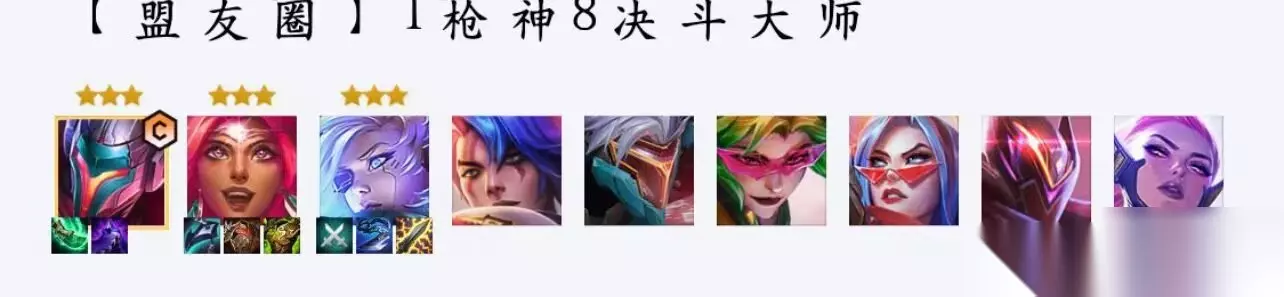1、八决斗大师阵容是由亚索、尼菈、寒冰、厄斐琉斯、劫、薇恩、菲奥娜、普朗克、天使组成,如下图所示。