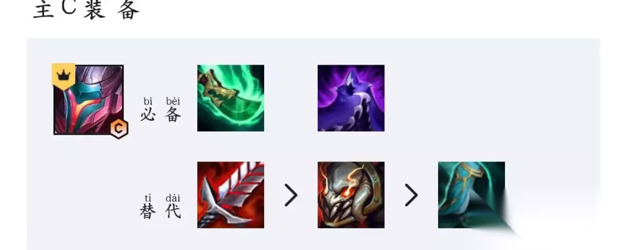 3、主C亚索的必备装备是朔极之矛、夜之锋刃,替代装备是饮血剑、泰坦的坚决、水银,如下图所示。
